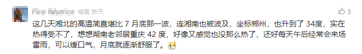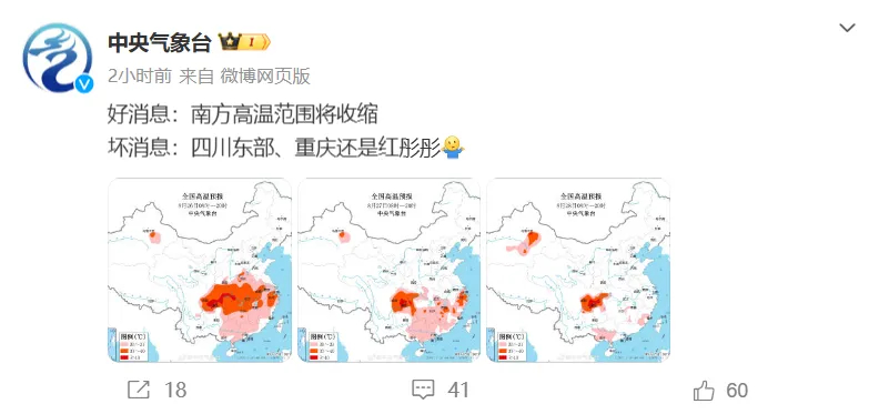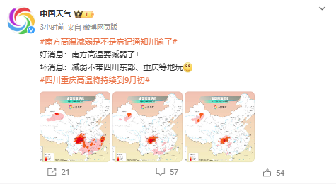 这天气热到中国天气也发文:“好消息:南方高温要减弱了!坏消息:减弱不带四川东部、重庆等地玩”。