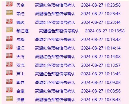 成都市气象台2024年08月27日10时00分继续发布高温红色预警信号:预计成都市武侯区、锦江区、青羊区、成华区、金牛区、高新南区、高新西区和青白江区的所有镇(街道)未来24小时内最高气温将升至37℃以上,东部新区的所有镇(街道)未来24小时内最高气温将升至40℃以上。高温时段主要出现在今日11时至19时。
