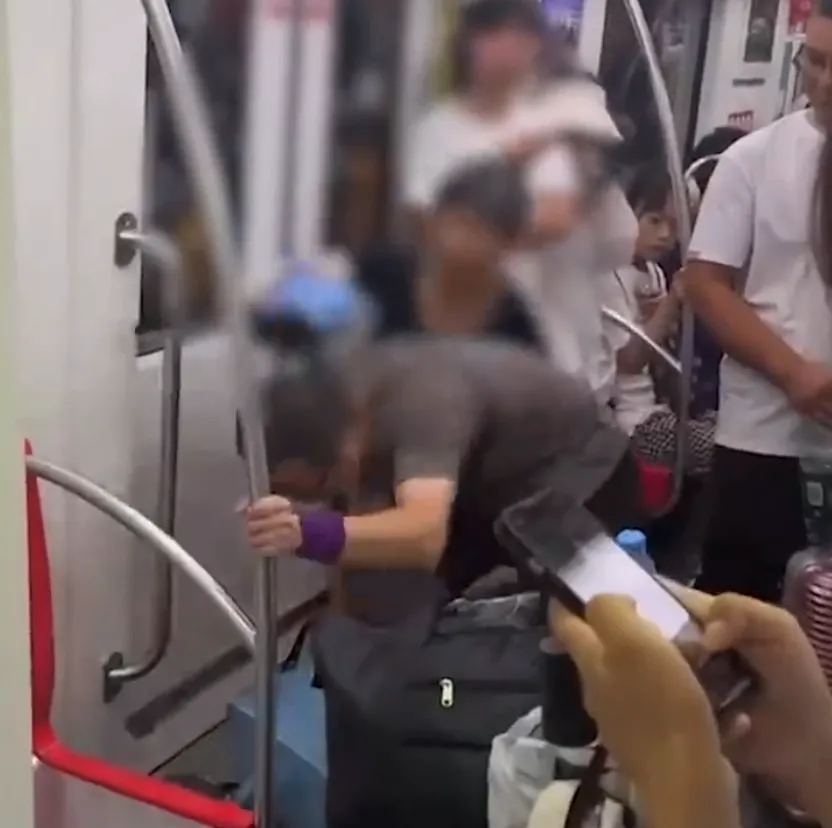 视频中显示,男子坐在地铁的座位上,老人站着不断用雨伞抽打坐着的男子,并一直说:让不让?让不让?