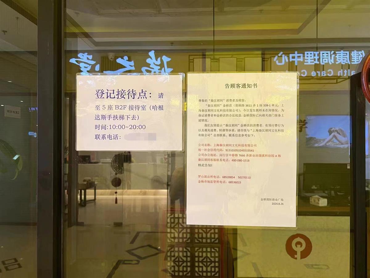 27日,梅女士找到金桥的门店,发现店铺大门已被上锁。上课的老师告诉她,他们未收到7月份的工资,门店负责人已经联系不上。门店所属商场方贴出通知称,8月26日,该门店发生教师未在岗情况,商场方已向相关部门报备。商场方面还提醒该门店消费者称,如果有预付费行为以及相关退费、转课等诉求,请尽快与秦汉胡同公司总部联系。
