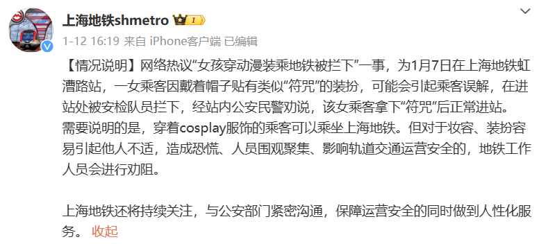 随后,上海地铁回应称:“穿着cosplay服饰的乘客可以乘坐上海地铁,但对于妆容、装扮容易引起他人不适,造成恐慌、人员围观聚集、影响轨道交通运营安全的,地铁工作人员会进行劝阻。”