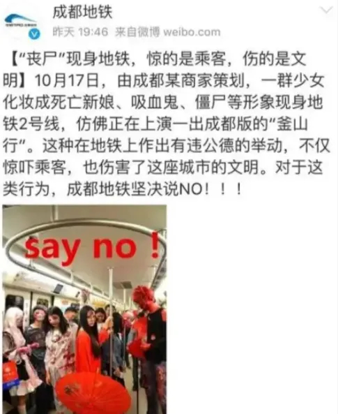 当时,在开往龙泉驿的成都地铁2号线上,演员们装扮成死亡新娘、吸血鬼等形象登上了地铁,引发热议。当时,成都地铁官方微博迅速做出回应,“‘丧尸’现身地铁,惊的是乘客,伤的是文明。这种在地铁上作出有违公德的举动,不仅惊吓乘客,也伤害了这座城市的文明。对于这类行为,成都地铁坚决说NO!”