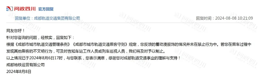 “网友您好!针对您咨询的问题,经核实,回复如下:根据《成都市城市轨道交通管理条例》《成都市城市轨道交通乘客守则》规定,您反馈的着动漫服饰的情况并未在禁止行为中。若您在乘车过程中发现其他乘客的不文明行为,可及时告知车站工作人员或列车巡视人员,我们将及时予以制止。以上情况已于2024年8月6日17时,与您联系,您表示满意,感谢您对成都轨道交通事业的理解与支持!”