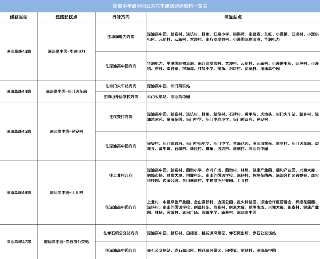为给该高中园师生提供优质通勤服务,在市交通运输局深汕管理局的支持下,深汕巴士公司开通深汕高峰44路,往返深圳中学高中园和鲘门高铁站,无缝衔接高铁到发站时间;开通深汕高峰43路、45路、46路、47路等4条公交线路往返深圳中学高中园至深汕特别合作区四镇。这5条学生公交“专线”将根据学生出行人数配备运力,能够科学高效地保障师生安全便捷往返家园和校园。