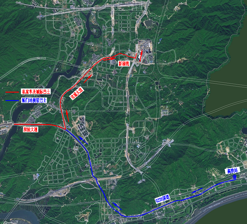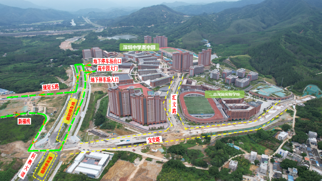 据统计,七成以上新生家庭计划自驾前往学校。选择自驾的家长们在深汕西高速吉隆收费站或梅陇收费站下高速后,将沿深汕大道(G228国道)经宜城大道和新福线最终到达科教大道(深圳中学高中园)。