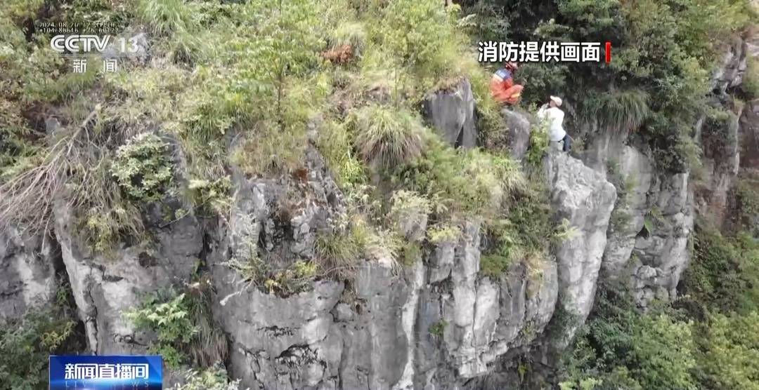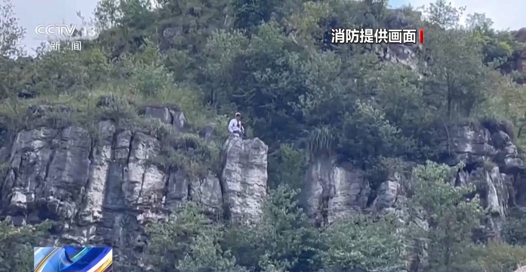 消防员携带救援装备登至山顶,成功将老人转移至山下安全地带。
