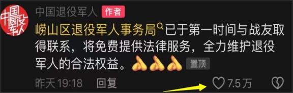 而同一时间,中国退役军人官号也发表评论称,崂山区退役军人事务局已于第一时间与战友取得联系,将免费提供法律服务,全力维护退役军人的合法权益。