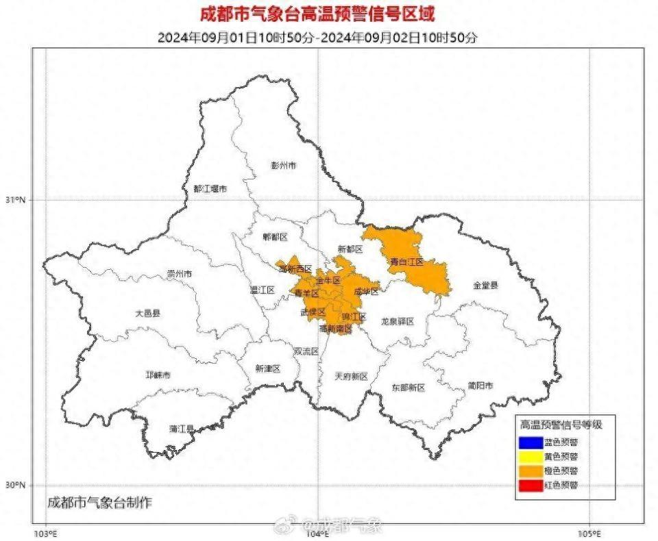 成都市气象台9月1日10时50分发布高温橙色预警信号:预计我市武侯区、锦江区、青羊区、成华区、金牛区、高新南区、高新西区和青白江区的所有镇(街道)未来24小时内最高气温将升至35℃以上。高温时段主要出现在今日13时至18时。请注意防范高温带来的不利影响。
