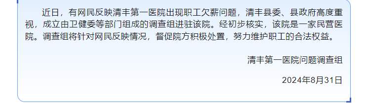 “情况说明”中介绍,有网民反映清丰第一医院出现职工欠薪问题,清丰县委、县政府成立由卫健委等部门组成的调查组进驻该院。经初步核实,该院是一家民营医院。调查组将针对网民反映的情况,督促院方积极处置,努力维护职工的合法权益。