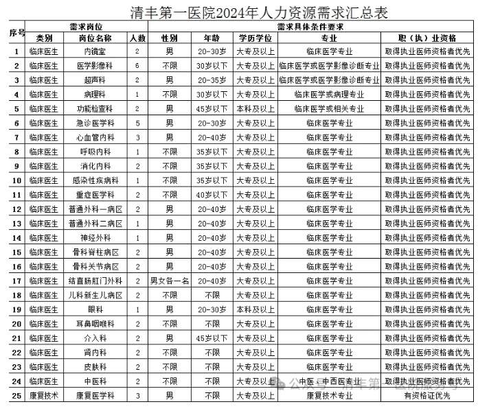 潇湘晨报记者检索发现,2024年2月21日清丰第一医院曾发布过人才需求公告。当时需求的岗位共有25个,人数超过50个,涵盖临床医生和康复技术两类。