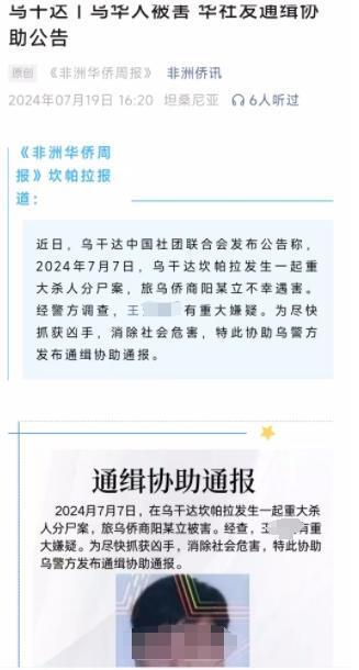 7月18日,乌干达中国社团联合会发布《通缉协助通报》称,2024年7月7日,在乌干达坎帕拉发生了一起重大杀人分尸案,旅乌侨商阳某立被害。经查,王某某有重大嫌疑。请广大华侨华人及当地居民积极提供线索。《通报》附带了王某某的照片和基本情况。