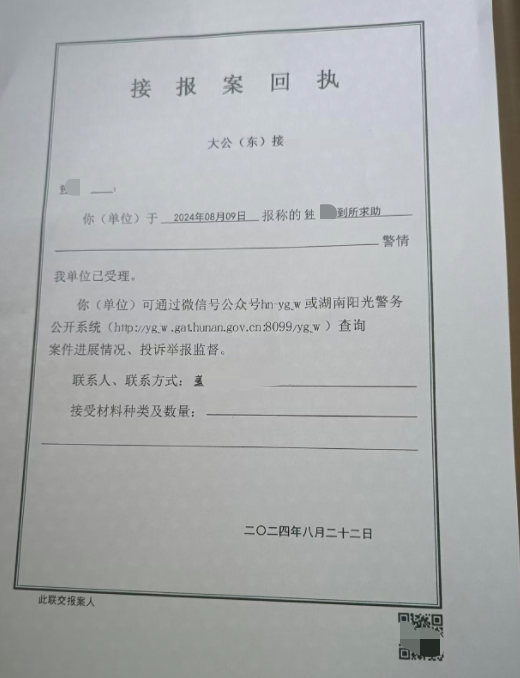 ▲邵阳警方接报案回执