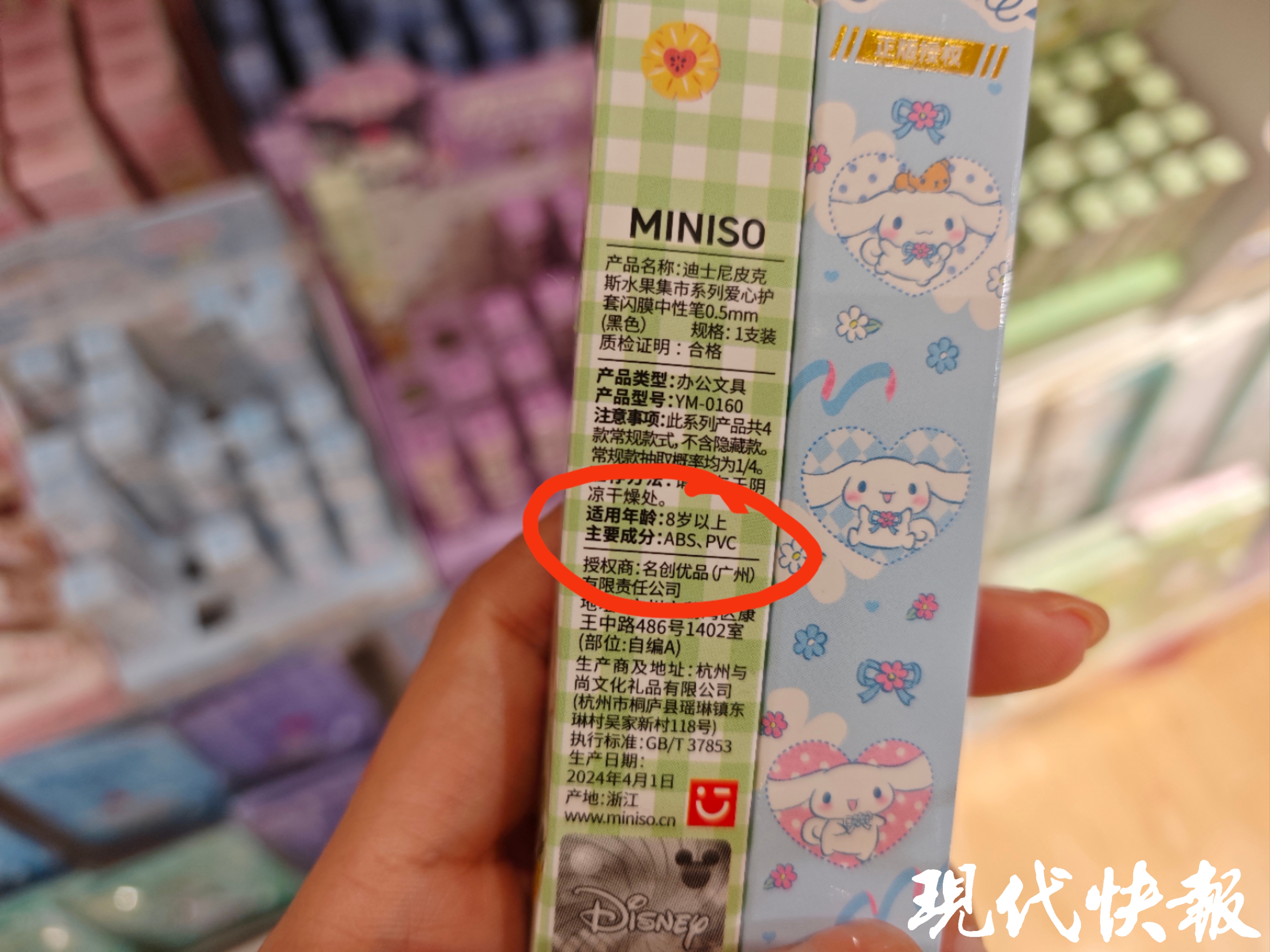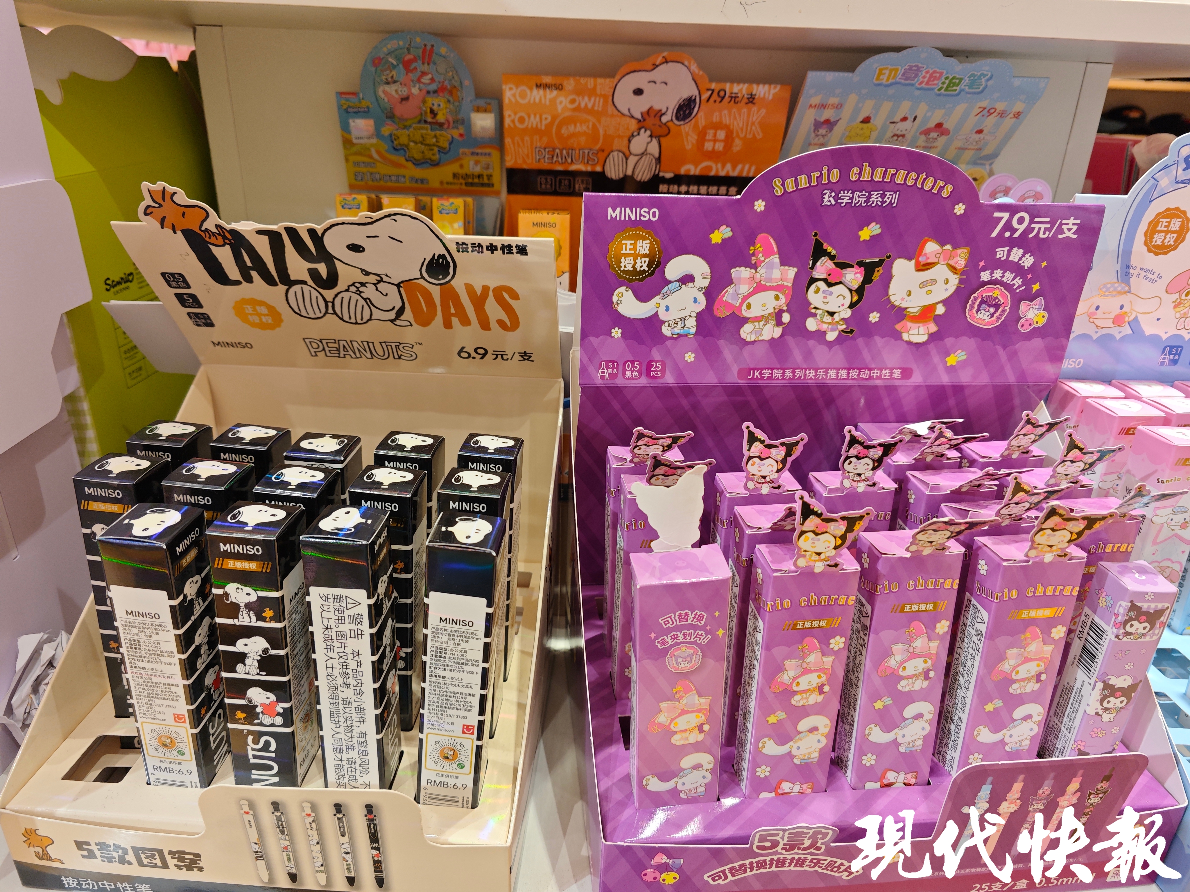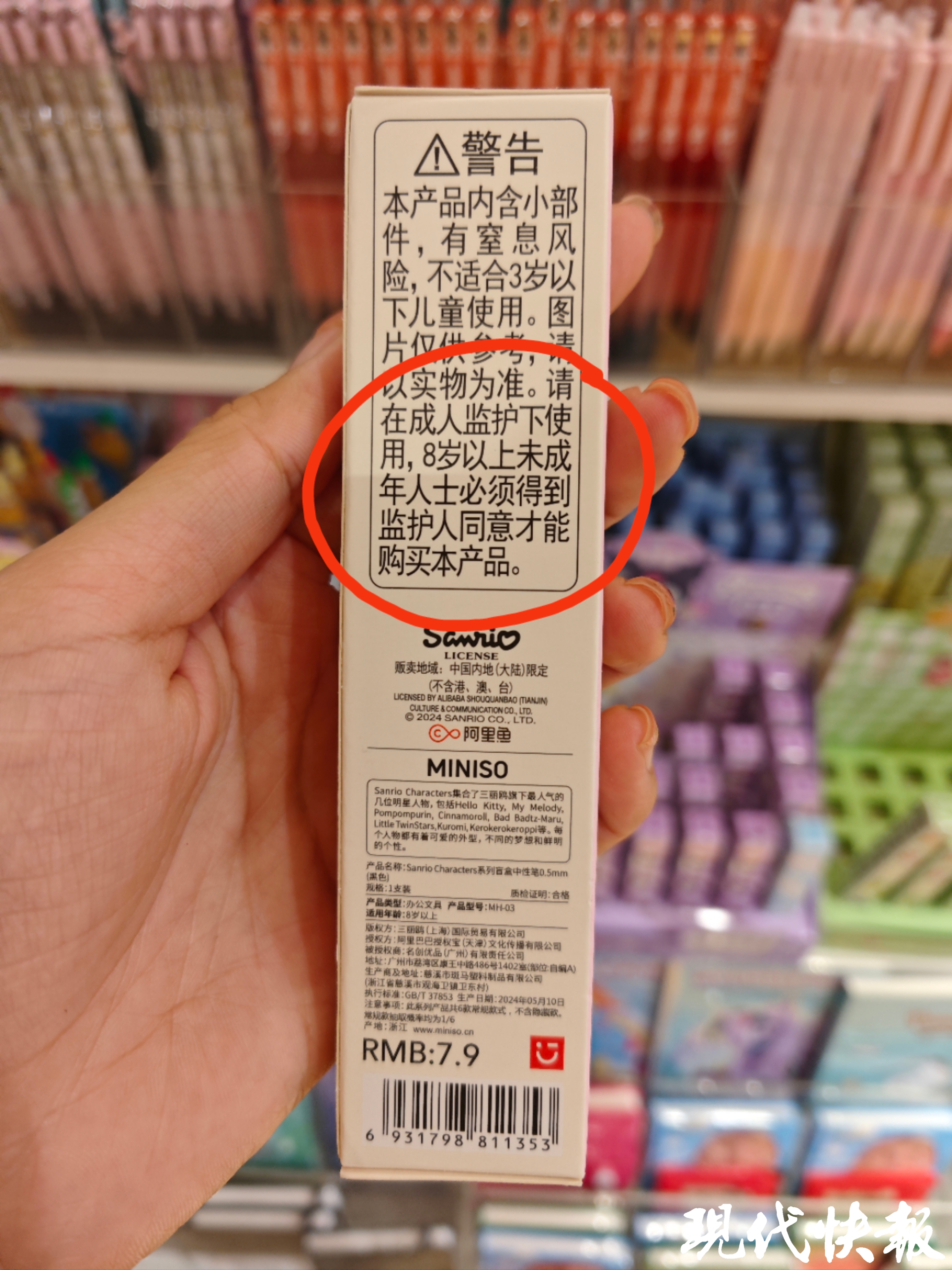 随后,现代快报记者来到珠江路一家礼品店,店里有一个柜台专门用来摆放文具盲盒,其中以中性笔盲盒居多。每个盲盒上印有不同的动漫IP,包括海绵宝宝、帕恰狗、史努比等等,很是可爱。盲盒的背面则印有“适用年龄8岁以上”,或是“8岁以上未成年人须得到监护人同意才能购买”等字样。店员告诉现代快报记者,盲盒文具很受欢迎,特别是最近开学季,每天都能卖出不少。
