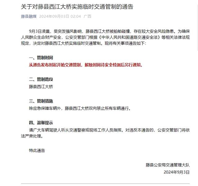 9月3日凌晨,受突发强风影响,藤县西江大桥被船舶碰撞,存在较大安全风险隐患。为确保人民群众生命财产安全,公安交管部门根据《中华人民共和国道路交通安全法》等相关法律法规规定,决定对藤县西江大桥实施临时交通管制。现将有关事项通告如下: