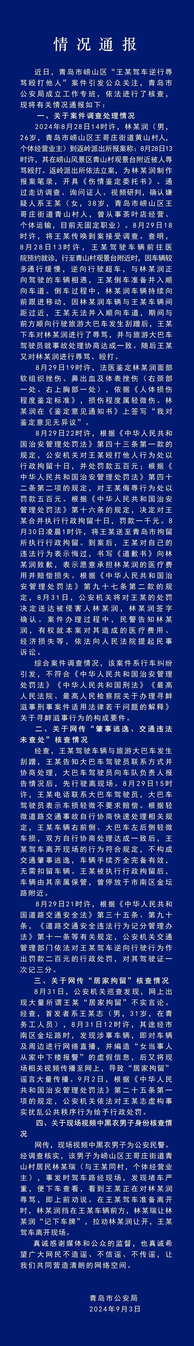 9月3日,青岛市公安局就“王某驾车逆行辱骂殴打他人”事件发布情况通报: