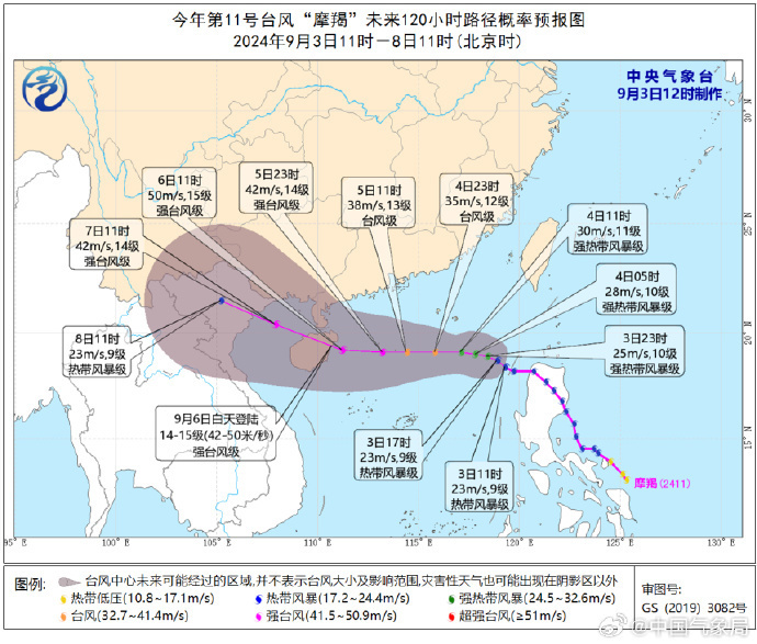 “摩羯”最强可达强台风级或超强台风级,可能于6日中午到夜间在海南岛东部沿海登陆,请有关部门持续关注海南省气象部门后续预报,分阶段、分步骤做好各项防御工作;