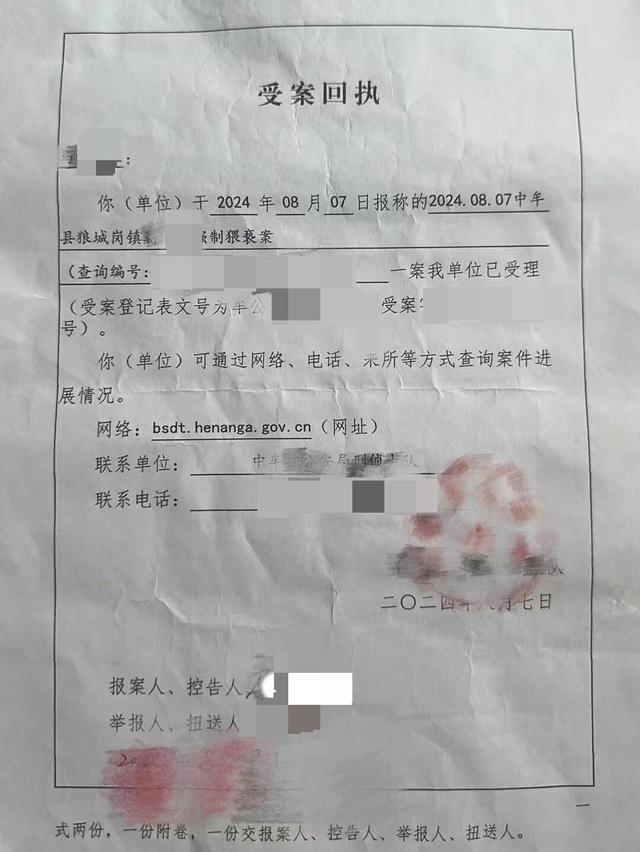 马先生提供了一份受案回执,显示马某某,你于2024年8月7日报称的中牟县狼城岗镇靳某强制猥亵案一案,我单位已受理。联系单位为中牟县公安局刑侦大队。