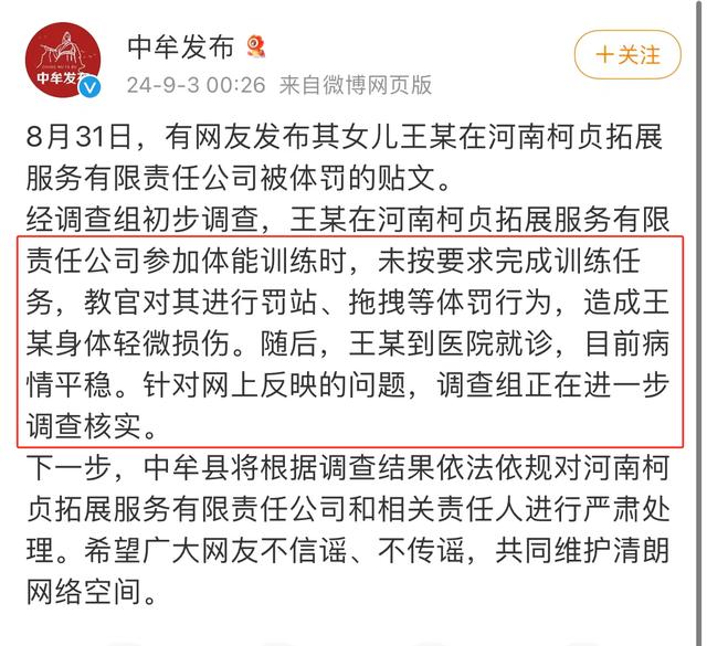 9月3日0时26分,中共中牟县委宣传部官方微博“中牟发布”通报称:8月31日,有网友发布其女儿王某在河南柯贞拓展服务有限责任公司被体罚的贴文。经调查组初步调查,王某在河南柯贞拓展服务有限责任公司参加体能训练时,未按要求完成训练任务,教官对其进行罚站、拖拽等体罚行为,造成王某身体轻微损伤。随后,王某到医院就诊,目前病情平稳。针对网上反映的问题,调查组正在进一步调查核实。下一步,中牟县将根据调查结果依法依规对河南柯贞拓展服务有限责任公司和相关责任人进行严肃处理。