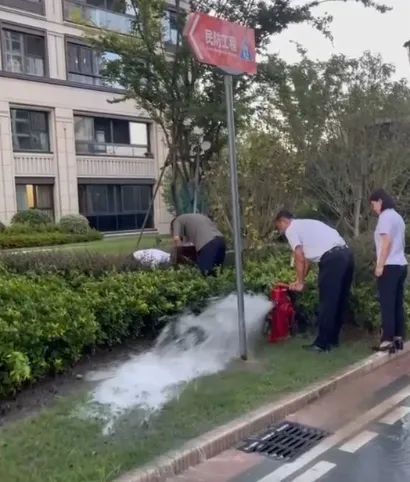 当时,一位物业工作人员使用手持灭火器扑灭了火源。不久后,消防人员赶到小区,研判后决定使用小区地面消防栓,进行隐患扑灭。但此时大家却惊讶却地发现,消防栓内没有水。