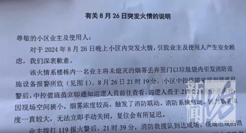 业主沈先生告诉记者,8月26日晚8点25分,自己所在的5号楼突然警铃大作,“现在有紧急情况,请大家保持镇静”,经过5楼逃生通道时,他才发现是该楼层发生了火情。