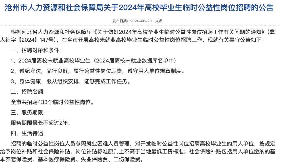 近日,河北多地发布面向2024年未就业高校毕业生的公益性岗位,招聘单位涉及各地人社局、统计局、乡镇政府等,待遇为当地最低工资标准。