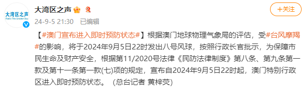据大湾区之声微博消息,根据澳门地球物理气象局的评估,受台风“摩羯”的影响,将于2024年9月5日22时发出八号风球,按照行政长官批示,为保障市民生命及财产安全,根据第11/2020号法律《民防法律制度》第八条、第九条第一款及第十一条第一款(七)项的规定,宣布自2024年9月5日22时起,澳门特别行政区进入即时预防状态。