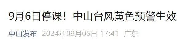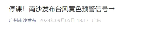 据深圳发布,深圳市气象台2024年09月05日19时将盐田区、大鹏新区、珠江口、深圳湾、大鹏湾、大亚湾、南山区(南头、南山、沙河、蛇口、招商、粤海街道)和宝安区(福永、西乡、新安、航城、福海街道)台风蓝色预警信号升级为黄色,预计受超强台风“摩羯”靠近影响,深圳市风雨逐渐加大,沿海、高地和海区最大阵风8-10级。全市中小学、幼儿园和托儿所停课。据央视新闻此前消息,受强台风“摩羯”影响,澳门教育及青年发展局5日宣布,小、幼及特殊教育全天停课,中学教育照常上课或进行教育活动。