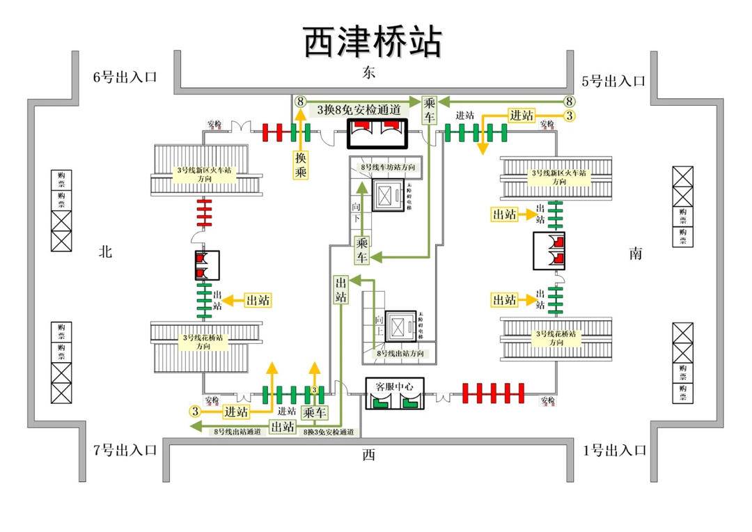 西津桥站乘坐3号线的乘客可从5、7号口通道旁安检后验票进站,乘坐8号线的乘客可从5号口通道旁安检后无需验票直接进站。换乘的乘客绕行至站厅验票出站后直接进入对应线路区域乘车,无需二次安检。