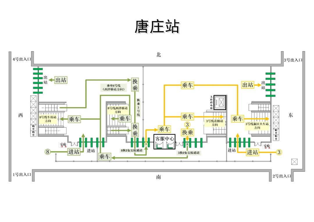 唐庄站乘坐3号线的乘客从2号口通道旁安检后验票进站,乘坐8号线的乘客从1号口通道旁安检后无需验票直接进站。换乘的乘客需绕行至站厅验票出站后直接进入对应线路区域乘车,无需二次安检。