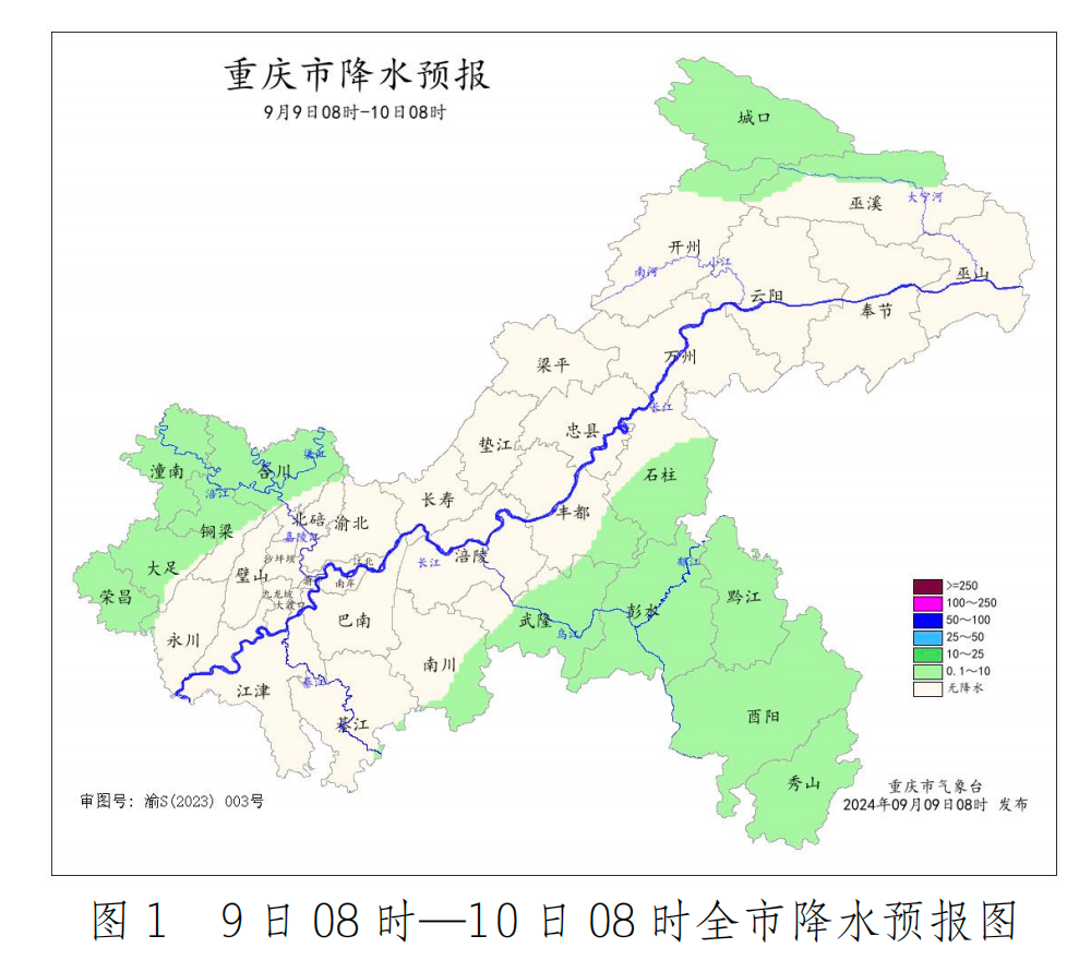 根据实时监测显示,8日07时—9日07时,我市晴到多云为主,部分地区出现阵雨或雷雨,局地伴有阵性大风;雨量小到中雨,东南部局地大雨;江津、南川、梁平、酉阳等4个区县的4个气象观测站出现8级以上阵性大风,其中最大风速18.7m/s(8级,南川金佛山9日01时);气温21~39℃,江北、九龙坡、南岸、渝中、大渡口、北碚、沙坪坝、潼南、合川、铜梁、璧山、江津、綦江、长寿、涪陵、丰都、梁平、开州、云阳、巫溪、高新区、两江新区等22个区县最高气温超过37℃,最高达39.1℃(巫溪)。