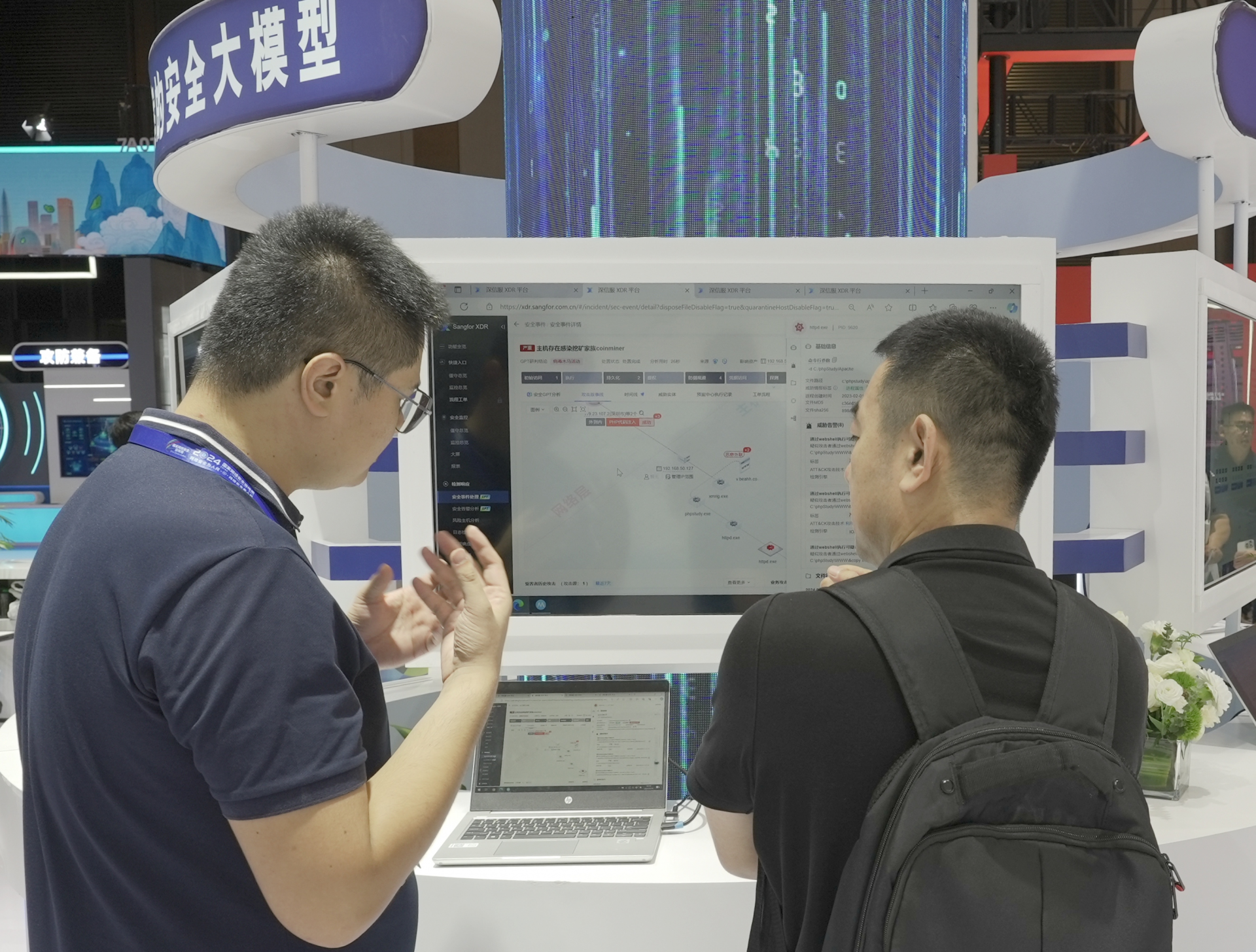 深信服科技则展出了国内首个网络安全领域垂类大模型产品——安全GPT。据介绍,安全GPT能够为政府及企业用户提供7×24小时实时在线智能值守,提升安全运营效率,并深度挖掘传统安全设备难以检测的高对抗、高绕过的Web攻击、钓鱼攻击。