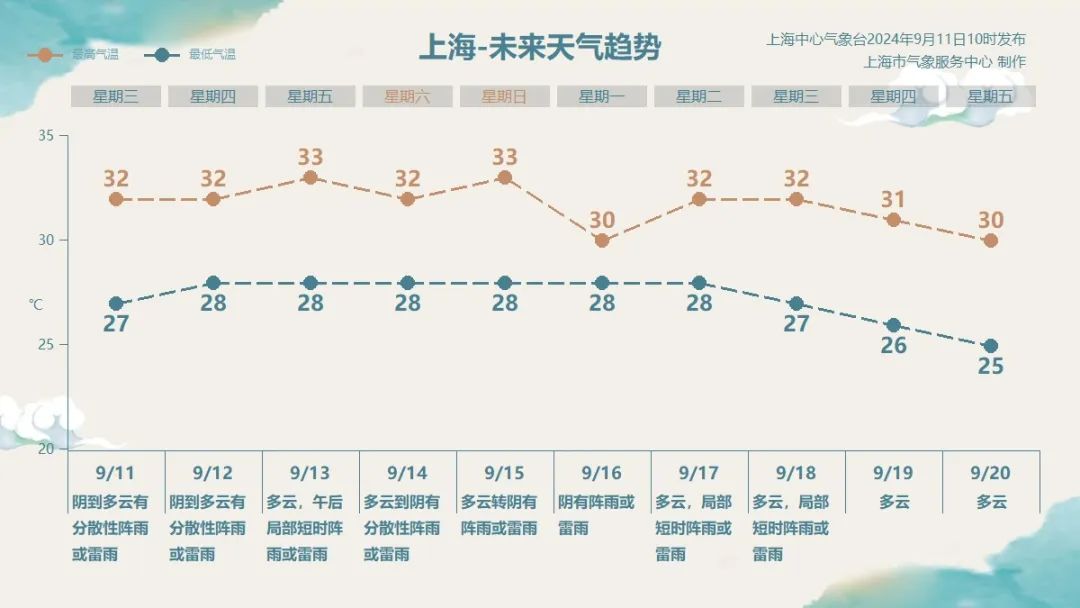 上海天气趋势:周四到周六,上海处在副热带高压边缘,主要受偏东气流影响,云系较多,有些短时的降水。气温总体保持在28~33℃之间。后期申城和华东地区的天气情况主要取决于“贝碧嘉”的路径和强度变化,也请大家及时留意最新的预报信息。