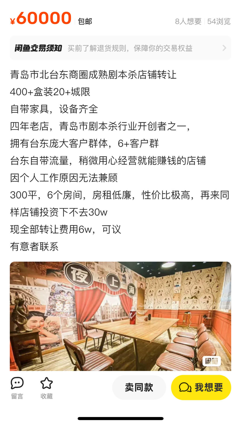 记者在闲鱼平台检索关键字后看到多条转让信息。其中有青岛市北台东商圈成熟剧本杀店铺转让,400多个盒装本加20多个城限本,四年老店,青岛市剧本杀行业开创者之一,全部转让费用6万元,价格可议;青岛崂山区剧本杀店转让,同为四年老店,店内面积达200平方米,正版桌游50多个,4个玩家群,转让费4万元。此外,还有市南区以及黄岛区的多家门店正在转让。