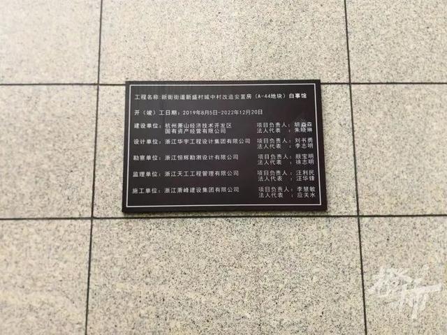 记者来到新盛璟城小区,共8幢房,目前还没入住,7幢和1幢之间是裙楼,计划中的白事馆靠近7幢,墙上有块铭牌,工程名称:新街街道新盛村城中村改造安置房(A-44地块白事馆)。