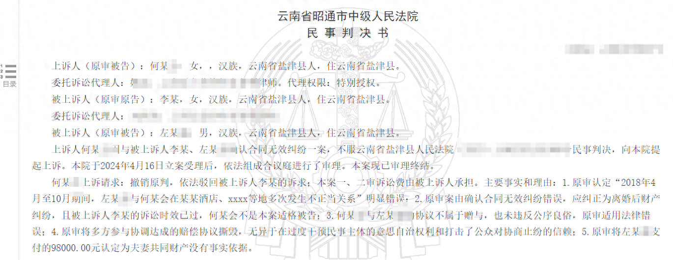 一审法院审理认为,左某在婚姻关系存续期间与何某多次发生不正当关系,有悖社会道德,违反婚姻法中规定的夫妻忠实义务,二人的行为之间属于违法关系,不应受到法律保护。本案诉争协议系二人发生情感纠葛,左某打何某耳光,报警后经双方多次协商,左某给何某9.8万元,根据何某在公安机关笔录中陈述,因与左某多次发生不正当关系,双方私下协商,不想把事情闹大,左某的陈述为多次发生不正当关系,为了不影响家庭,给9.8万元解决此事。何某明确表示不做伤情鉴定,未造成肢体上的伤害。由此能够认定,双方达成的9.8万元并不完全是赔偿何某被打的损失,而是因双方多次发生不正当关系,左某为了平息此事对何某作出的一种补偿。
