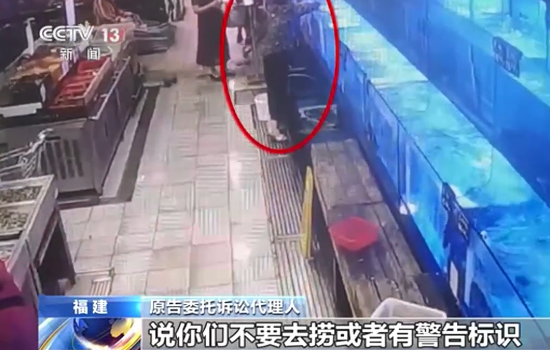 我们可以在超市的监控里看到,王女士在生鲜鱼货的水箱前选购鱼,在把鱼装进袋子时,发生了意外,跳动的鱼刺伤了王女士的手掌。