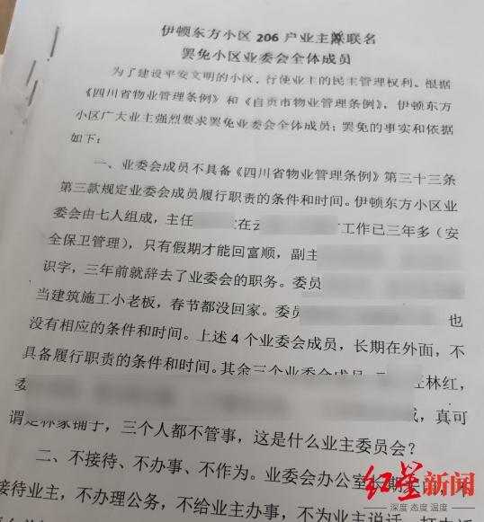 红星新闻记者注意到,对于“罢免”原因,200余户业主的联名信显示,主要有“不具备履职条件和时间”“不接待、不办事、不作为”“不公布收支和资金情况”等。
