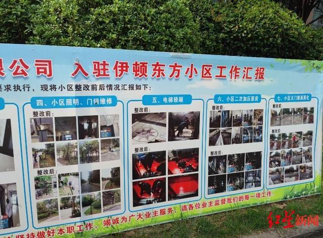 小区物业公司一位工作人员告诉红星新闻记者,他们是通过招投标方式进驻该小区的,对于此前业委会与业主之间的情况不太清楚。刚刚进驻的时候,小区里杂草丛生,垃圾箱的摆放很乱,墙上小广告也很多。经过治理,已有了很大的改观,公司还把前后的对比照片公布在小区,供业主监督。