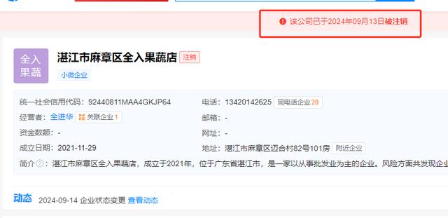 据天眼查信息显示,湛江市麻章区全入果蔬店已于9月13日被注销,其经营者是全红婵的哥哥全进华。
