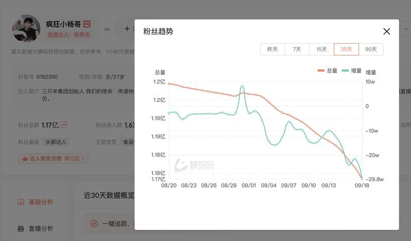 如今,受月饼事件影响,三只羊头部账号基本暂停直播带货,同时也在“疯狂”掉粉。截至9月18日,“疯狂小杨哥”30天内掉粉接近300万,当前粉丝数量为1.17亿。