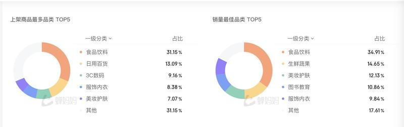 根据蝉妈妈统计,近30天,“三只羊网络”直播69场,累计销售额为2500万至5000万;“疯狂小杨哥”开播4场,累计销售额超1亿;“疯狂小杨弟(三只羊)”直播19场,累计销售额在100万至250万之间。其中,“三只羊网络”“疯狂小杨哥”上架商品最多品类、销量最佳品类第一均为食品饮料,分别占比31.15%和34.91%,以及42.68%和53.95%。