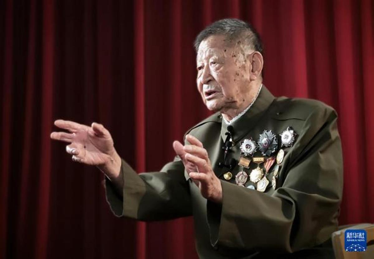 黄宗德接受采访时讲述自己的战斗经历(来源:新华社)