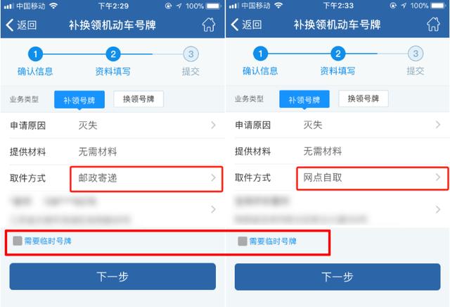 点击【下一步】,进入资料填写页面,填写业务类型、申请原因、是否需要临牌、取件方式、临牌邮寄地址和机动车号牌上牌点等资料信息。(如果你在拿到补换号牌前,需要驾车出行,可勾选【需要临时号牌】,补牌证期间,可使用临时号牌上路行驶。)