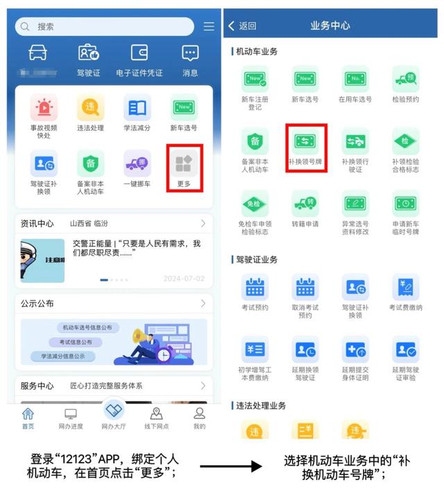 登录“交管12123”APP后,通过【业务中心】→【补换领机动车号牌】,进入办理业务流程,你可以补换领已备案本人机动车的号牌。
