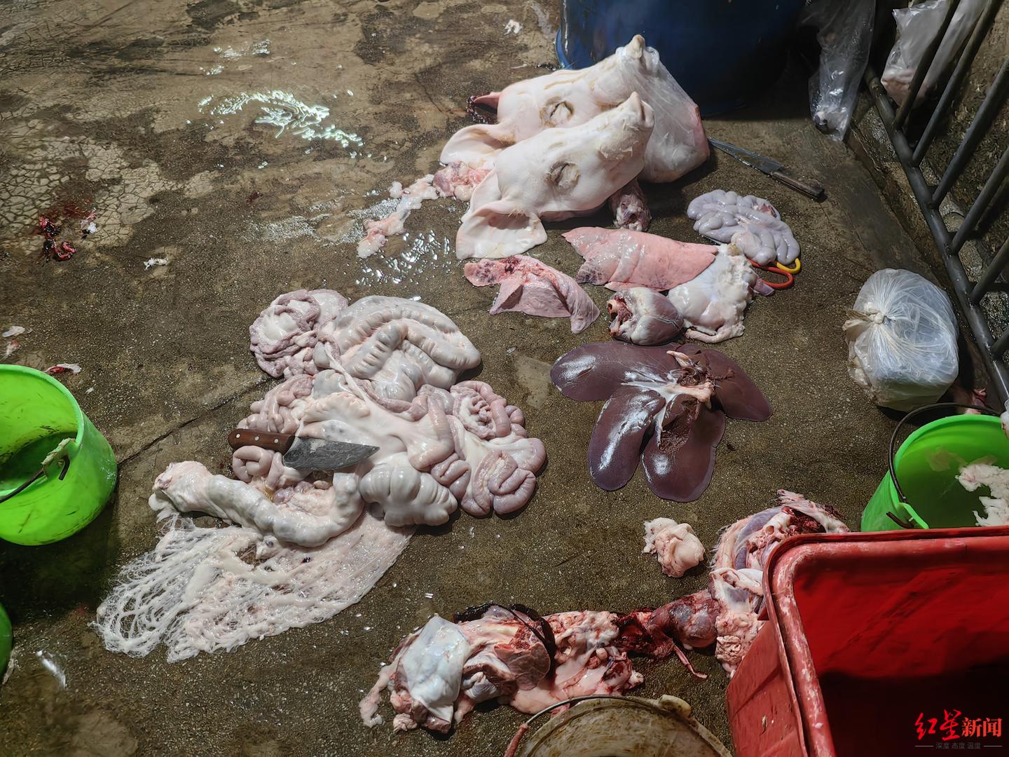 记者看到,这些男子穿着雨鞋,踩过屋外的泥巴路,又直接踩进屋里,屋里遍地血腥,地上污水横流,宰杀后的猪内脏、猪头等产品就在他们脚边。见到民警进来,男子们仍然没有停止手上的动作,持刀继续分解猪肉,一名老板模样的女性上前,跟民警辩解称这些猪都是“自己养的”。