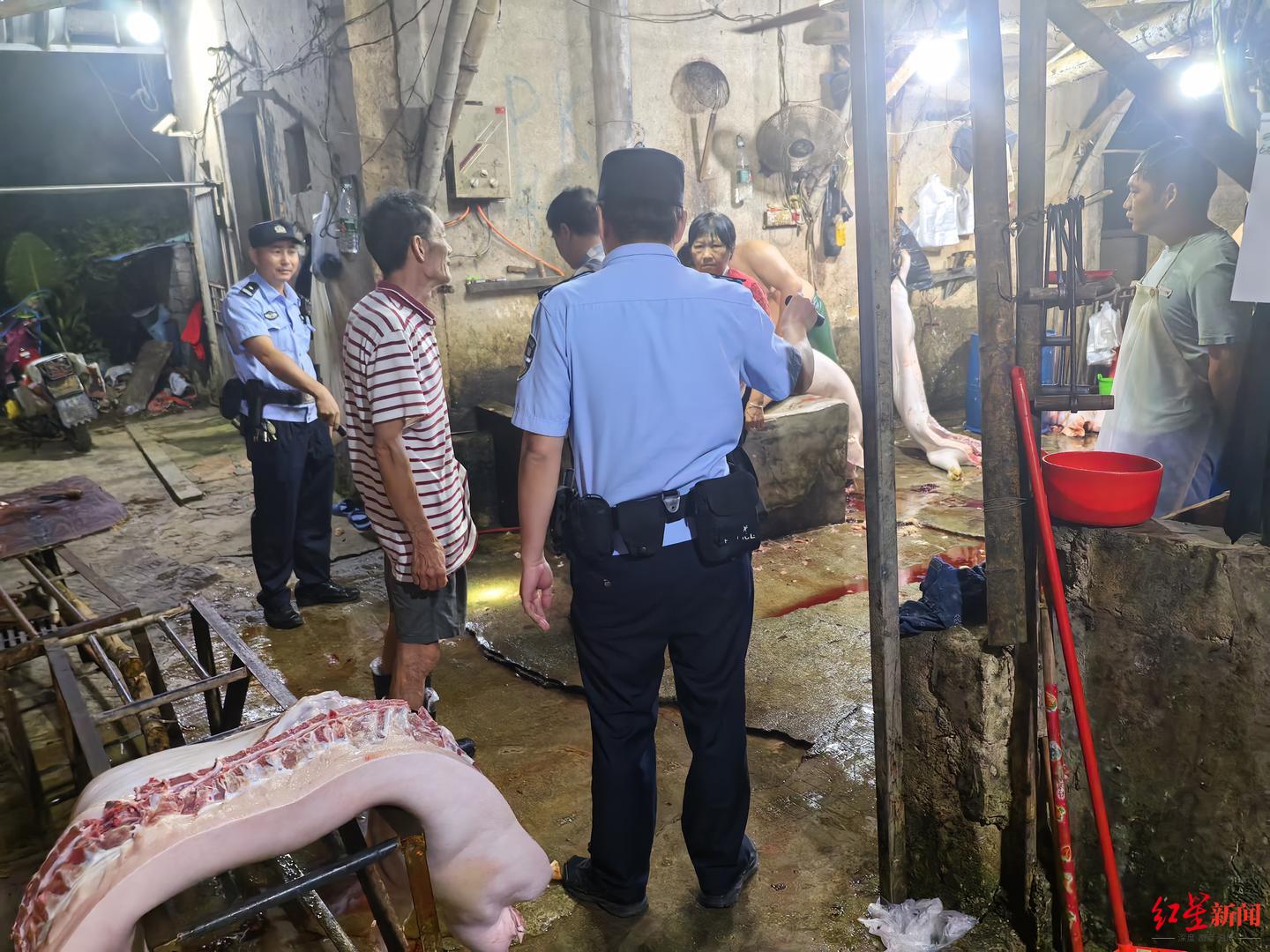 红星新闻记者从普宁市公安了解到,9月20日查封的这处窝点内,当晚6名涉案人员中,三名是来购买猪肉的摊贩,剩下三名则是宰杀人员,其中没有兽医。另外,与民警一起在该窝点内取证时,记者也没有在其中发现任何检疫设备。