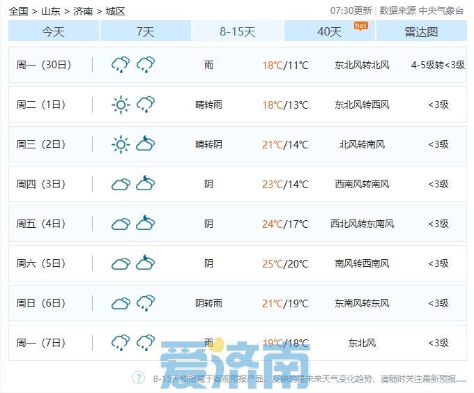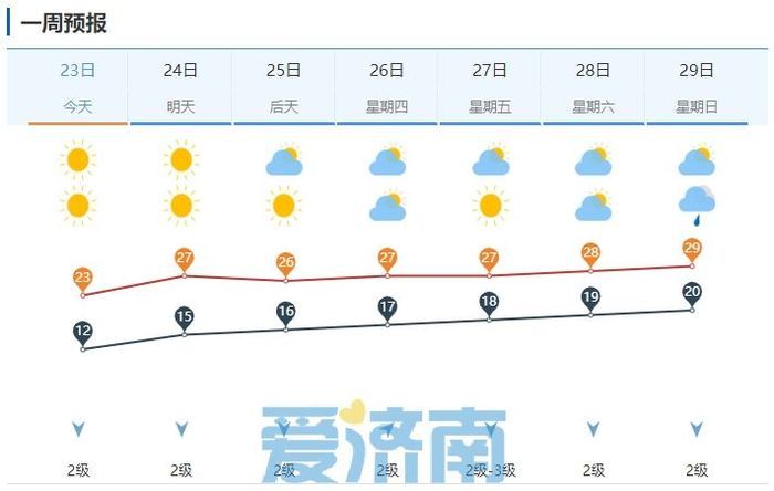 周日(29日)多云转阴,南风转北风3级,最低气温济阳区、商河县、南部山区、起步区16℃左右,市区及其他区县19℃左右,最高气温29℃左右。