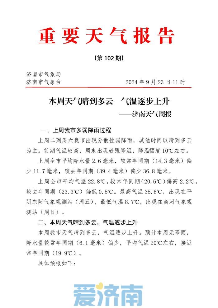 9月23日,济南市气象台发布最新重要天气周报,预计本周(9月23日至29日)济南天气以晴到多云为主,无降雨出现,气温逐步上升,过程升温幅度在6~10℃左右。不过,近期济南昼夜温差持续较大,大家早出晚归需注意保暖。