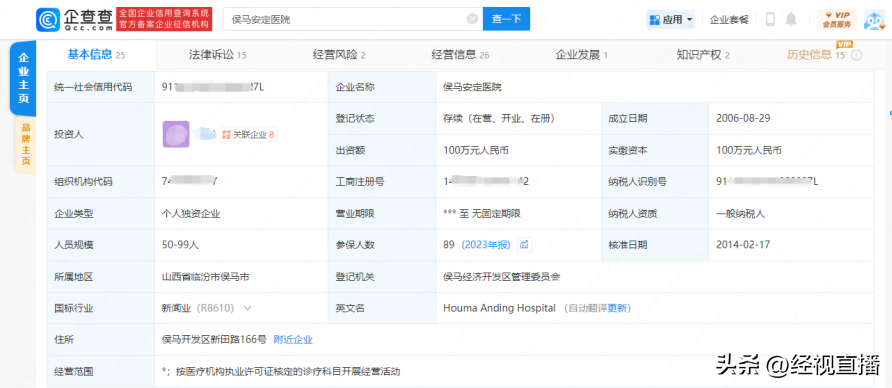 侯马安定医院官网显示,该院成立于1992年,为国家二级甲等医院。记者通过企查查查询发现,该医院系个人独资企业。