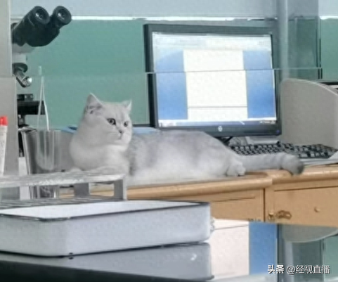 视频中,一只灰白相间的猫趴在一张办公桌上,桌子上摆放着一台显微镜和一台电脑,办公区内两名工作人员正在一旁工作,似乎对猫的存在习以为常。